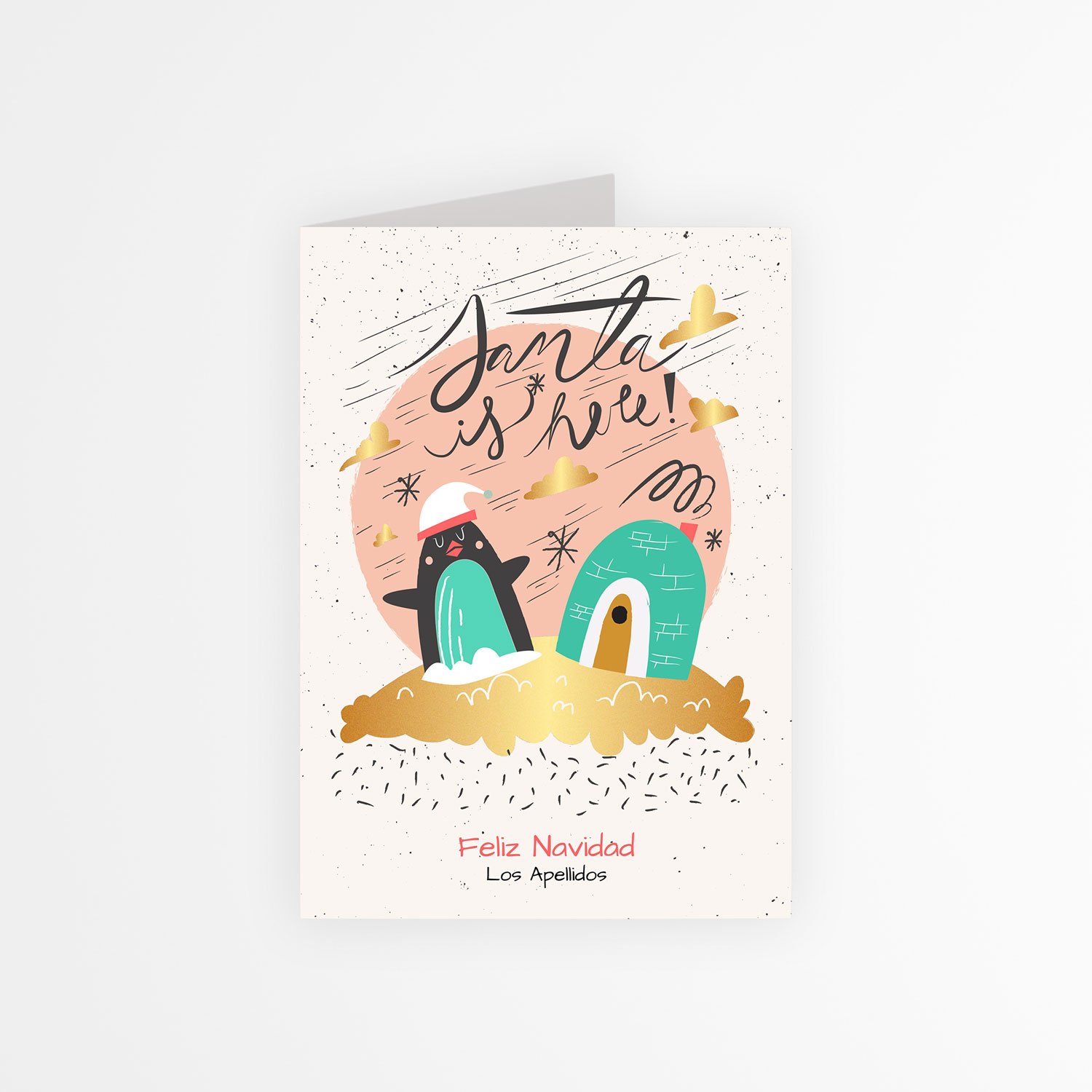 Un toque de magia invernal y ternura para desear unas fiestas inolvidables. Este pingüino navideño llega con brillo dorado, aire festivo y espacio para personalizar tu saludo y tus apellidos. Ideal para sorprender a familia y amigos con un detalle que se siente cercano, único y lleno de ilusión.